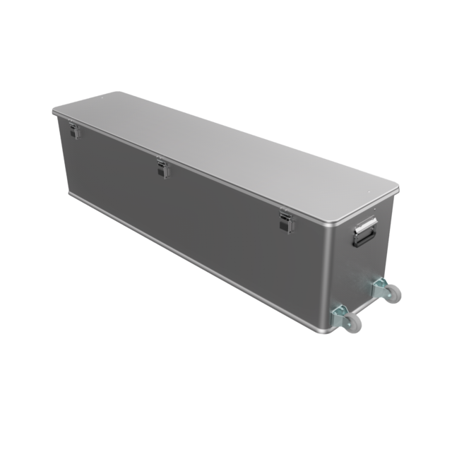 Die stabile Alubox ist mit drei Klappgriffen und integrierten Rollen ausgestattet, wodurch sie sich leicht manövrieren lässt.